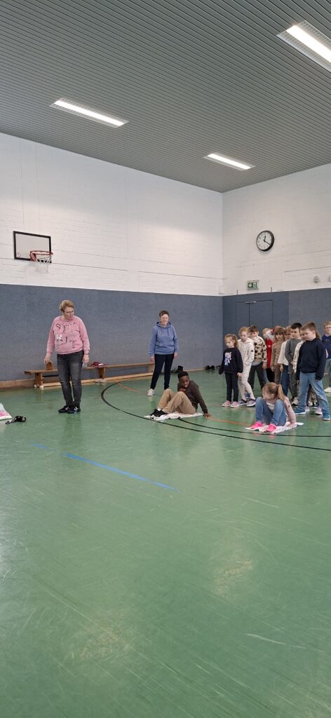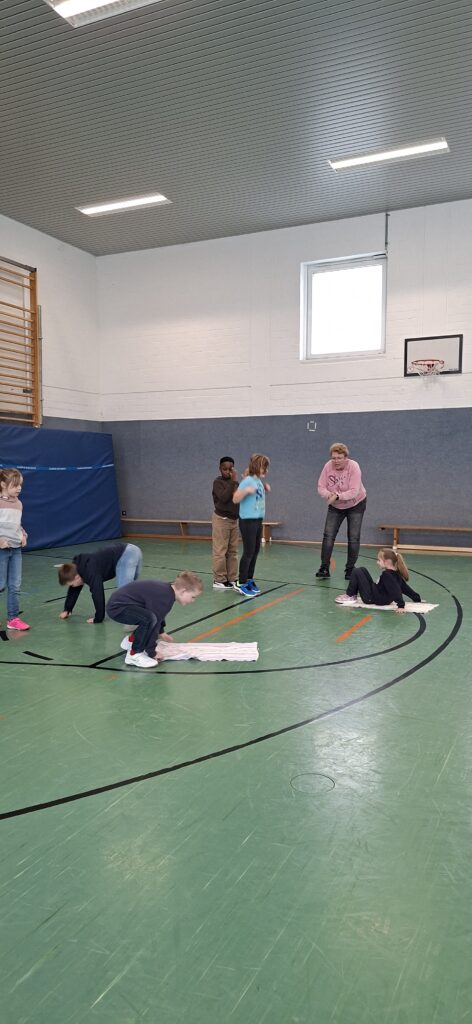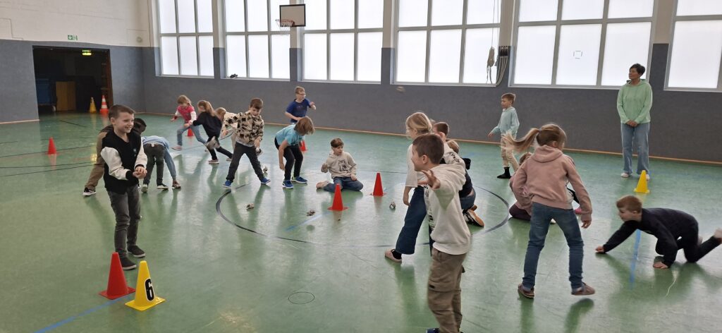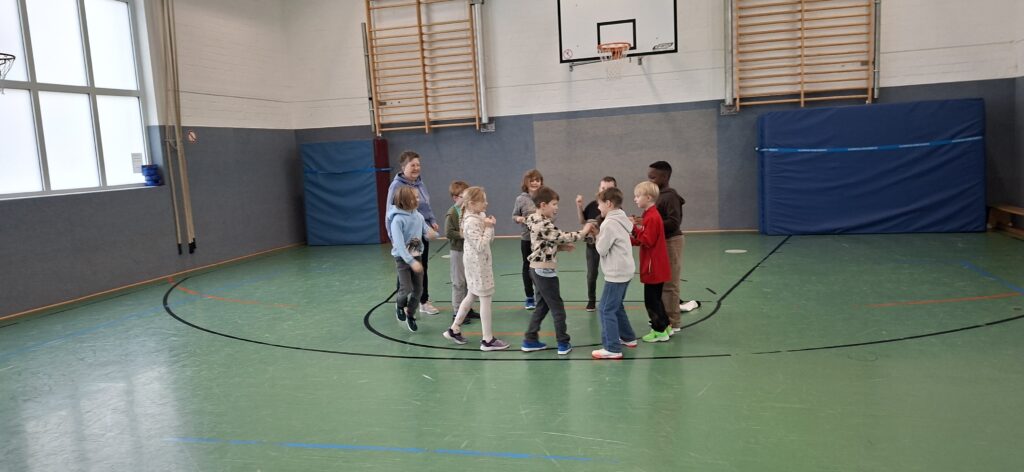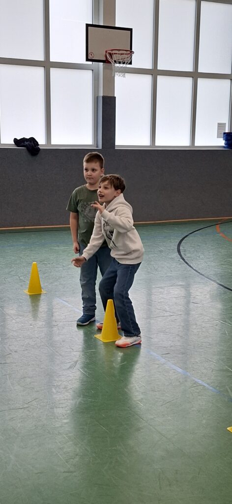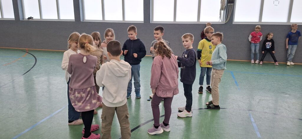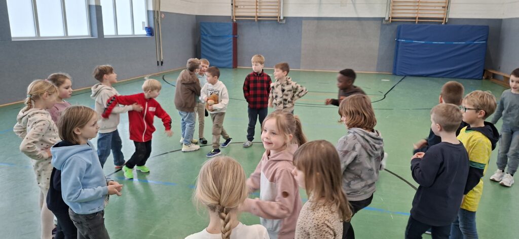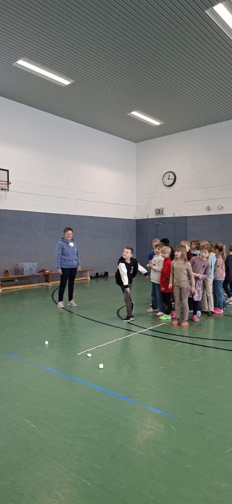 Der Jahrgang wurde in zwei Gruppen eingeteilt und startete sportlich in die Winterolympiade. Nach einem gemeinsamen Aufwärmen traten die Kinder in verschiedenen Disziplinen gegeneinander an. Beim Schneeflockenweitwurf und beim Rodeln auf Handtüchern standen Bewegung, Geschick und Teamarbeit im Mittelpunkt.