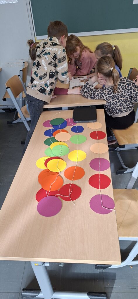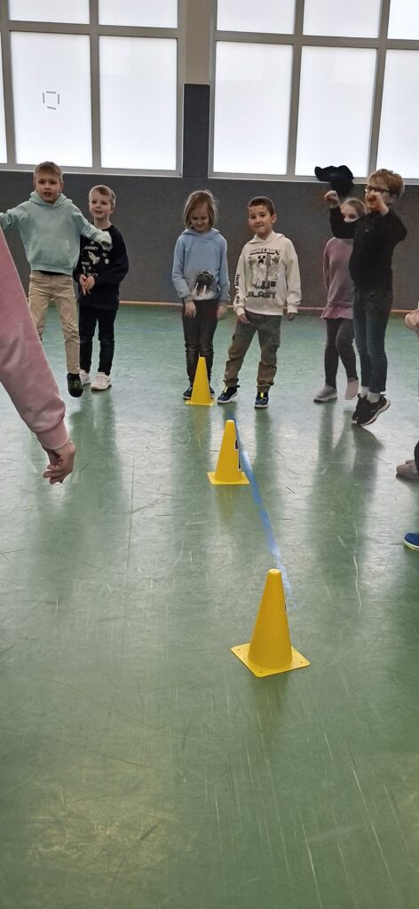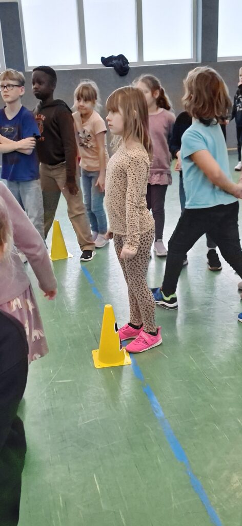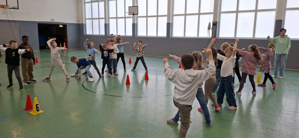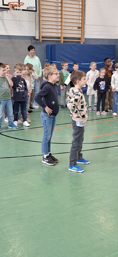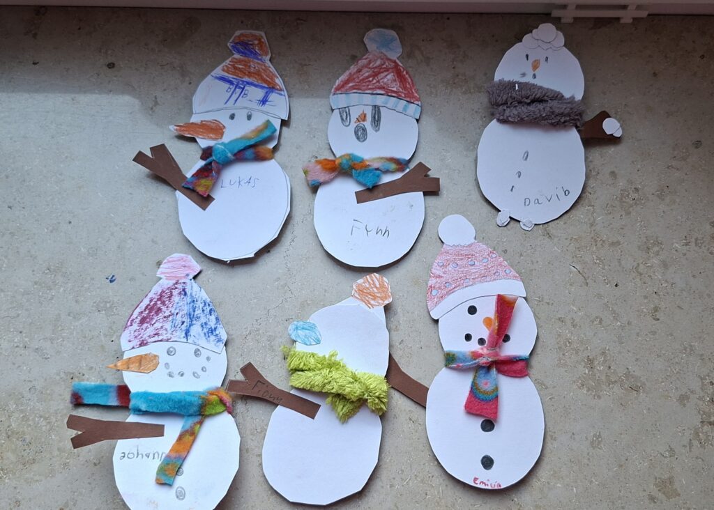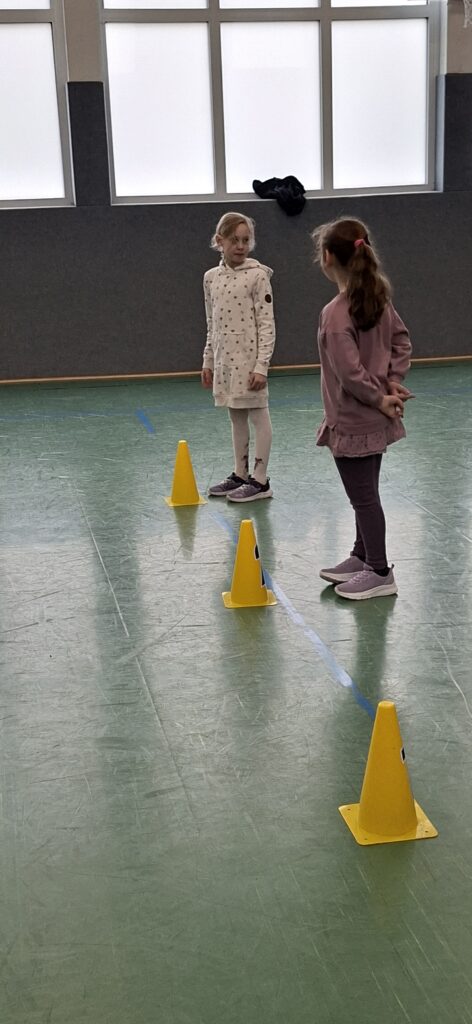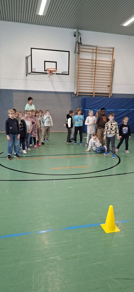 Der Jahrgang wurde in zwei Gruppen eingeteilt und startete sportlich in die Winterolympiade. Nach einem gemeinsamen Aufwärmen traten die Kinder in verschiedenen Disziplinen gegeneinander an. Beim Schneeflockenweitwurf und beim Rodeln auf Handtüchern standen Bewegung, Geschick und Teamarbeit im Mittelpunkt.