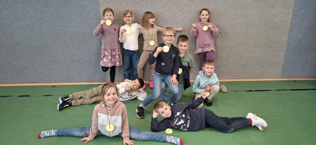 Zum Abschluss gab es ein gemeinsames Gruppenfoto 📸 Nach der Auszählung der Punkte stand es zwischen beiden Mannschaften unentschieden. Alle Kinder erhielten eine Medaille und konnten stolz auf ihre Leistung sein 🏅✨