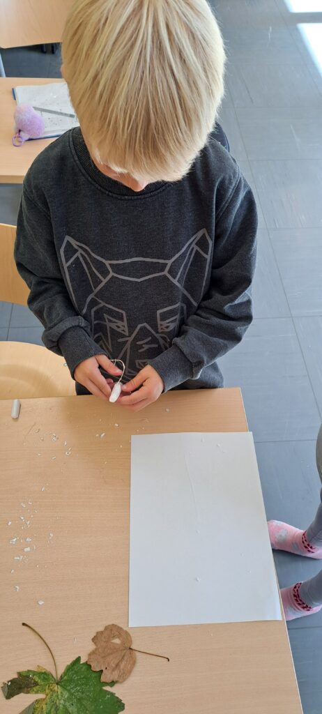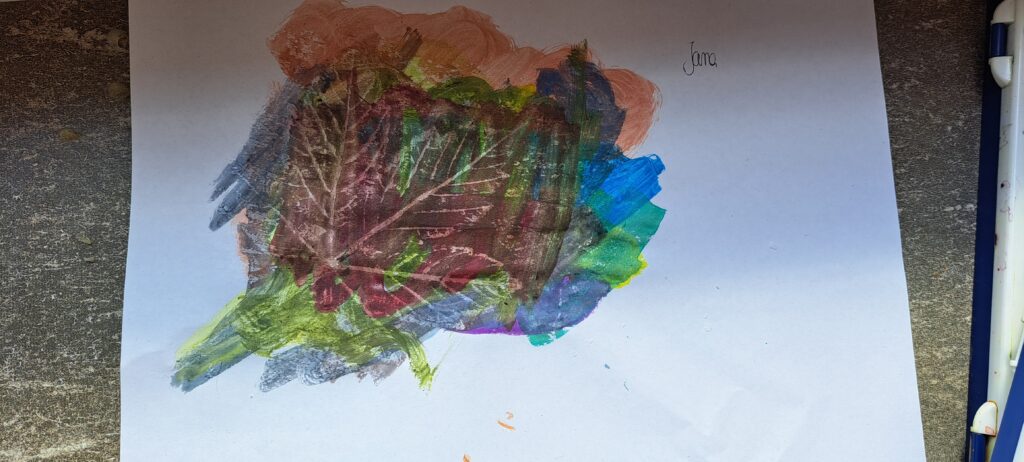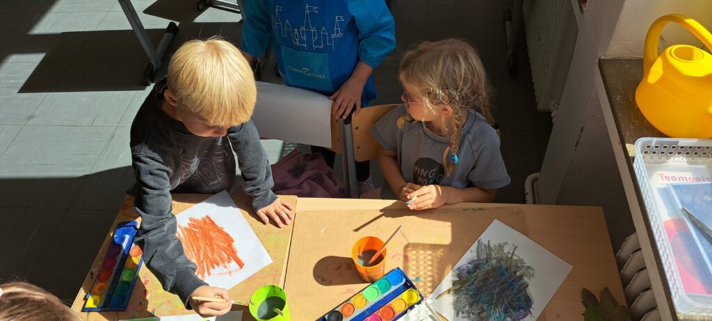 Kinder arbeiten kreativ mit getrockneten Blättern. Kerzenwachs und Wasserfarbe ergeben starke Farbeffekte 🎨🕯️