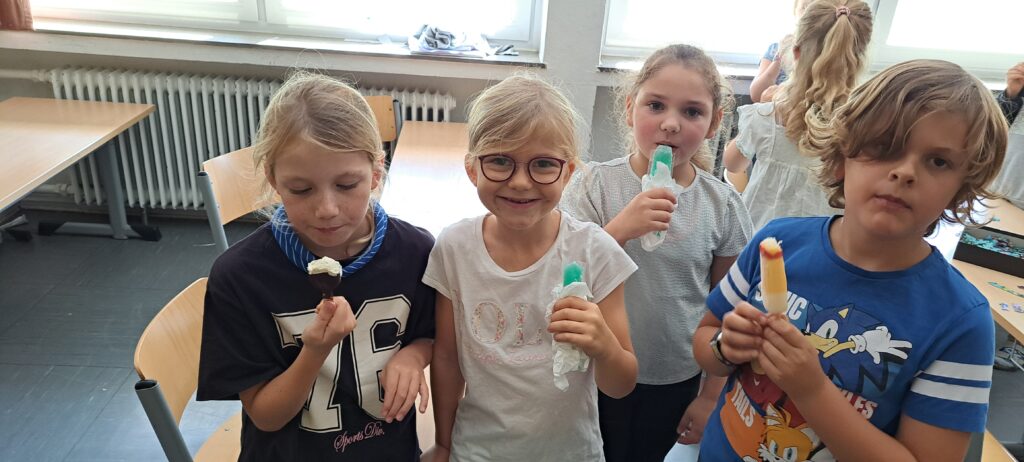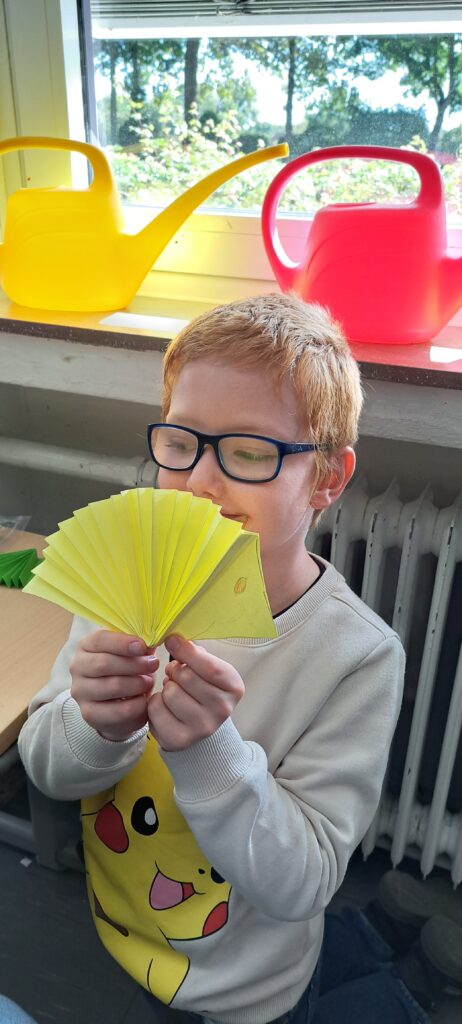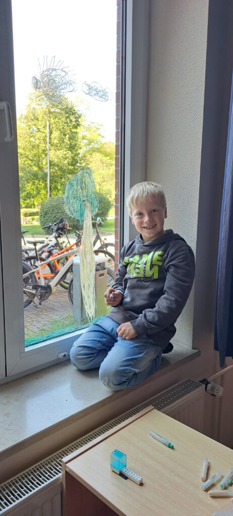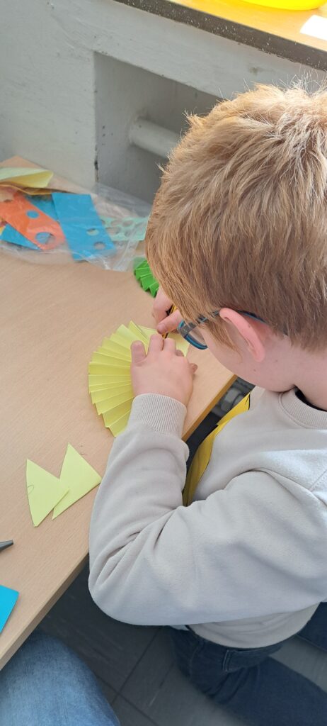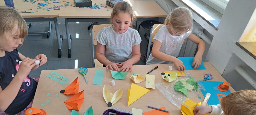 Die Kinder schneiden, falten und kleben. Die Ergebnisse hängen sichtbar an den Wänden. So wirkt der Ganztag lebendig und aktiv.