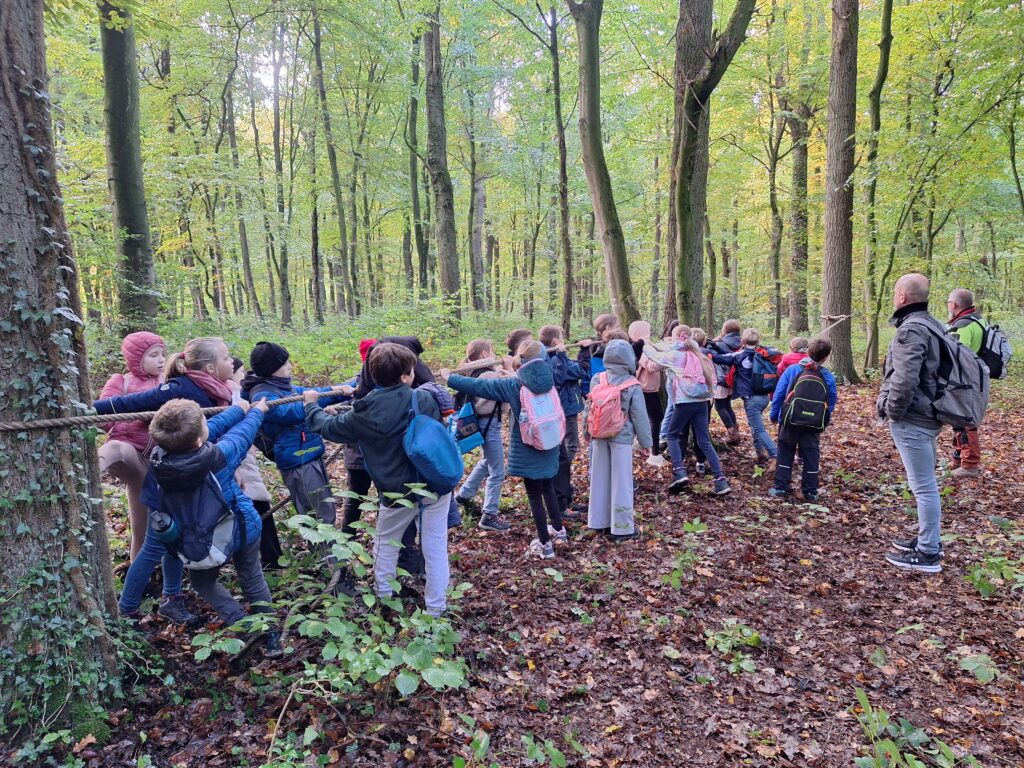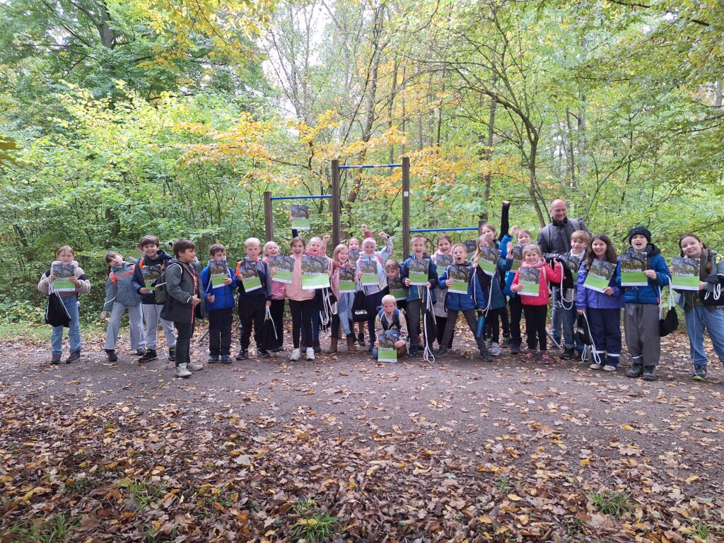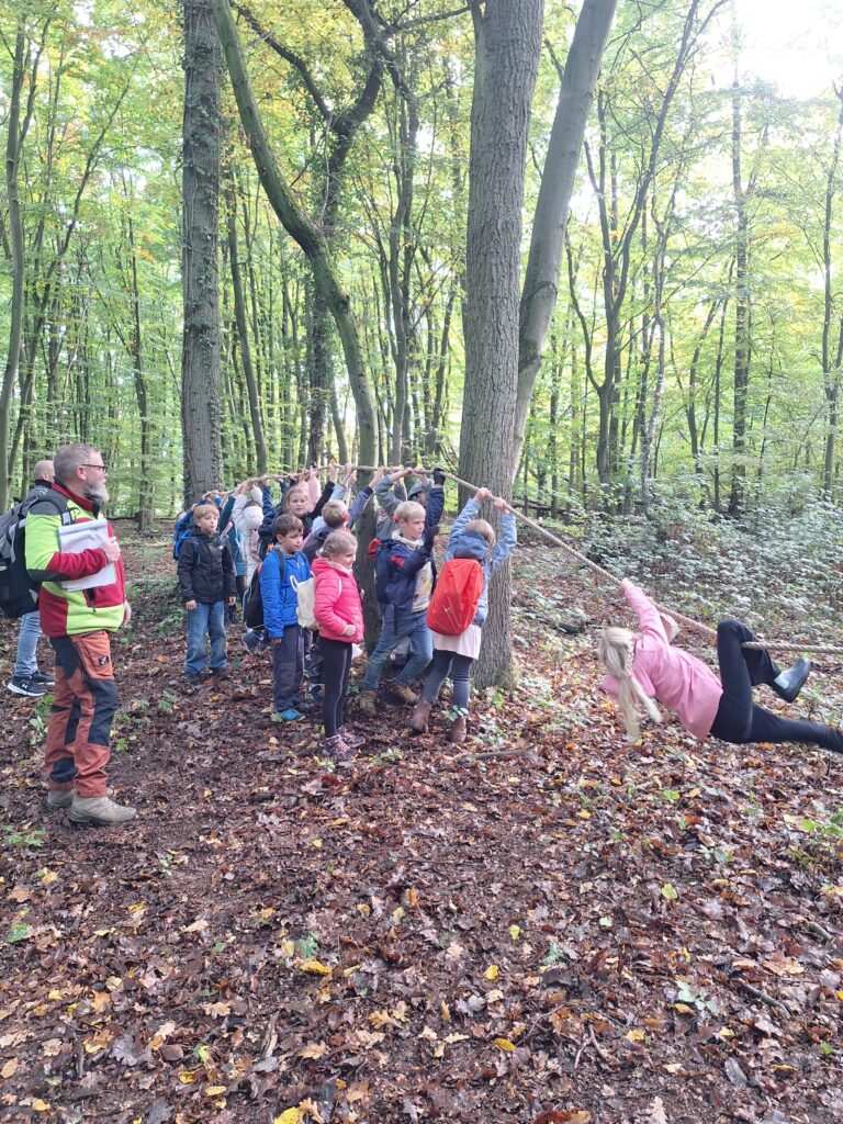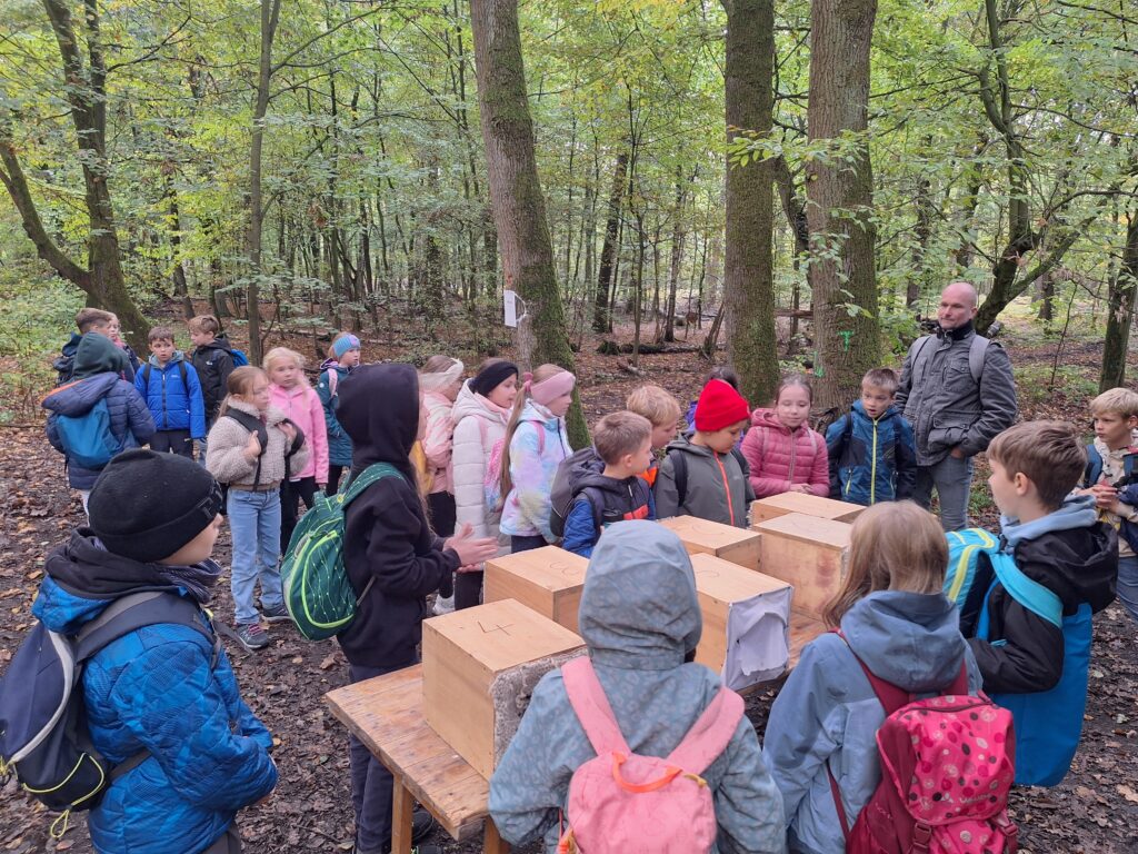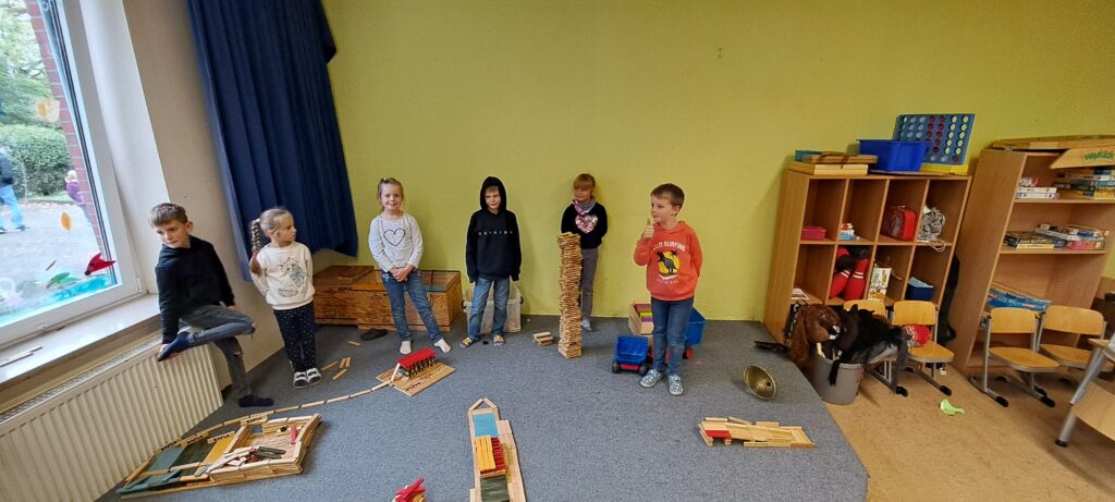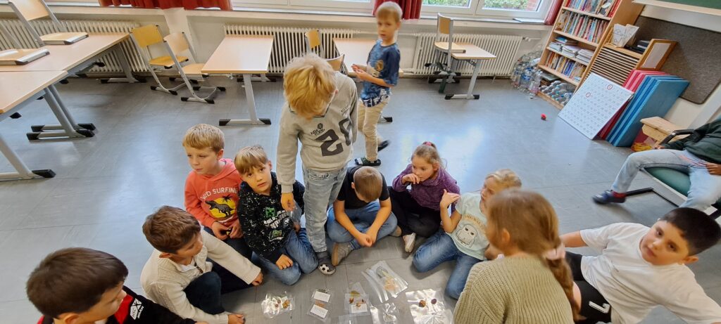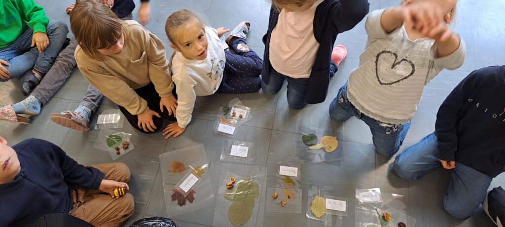 Sie bestimmten Blätter und Früchte. Dazu passten kurze Gespräche zum Erntedankfest. Viele genossen die warmen Temperaturen auf dem Schulhof. Dort wurde fleißig gebaut und konstruiert.