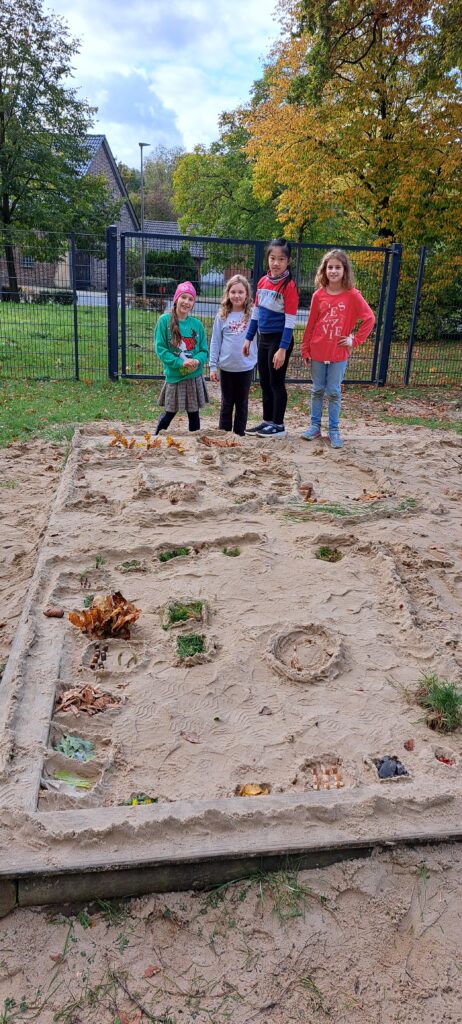 Im Sandkasten gestalteten sie kreative Bilder. Sie nutzten Naturmaterialien wie Stöcke, Blätter und Steine.