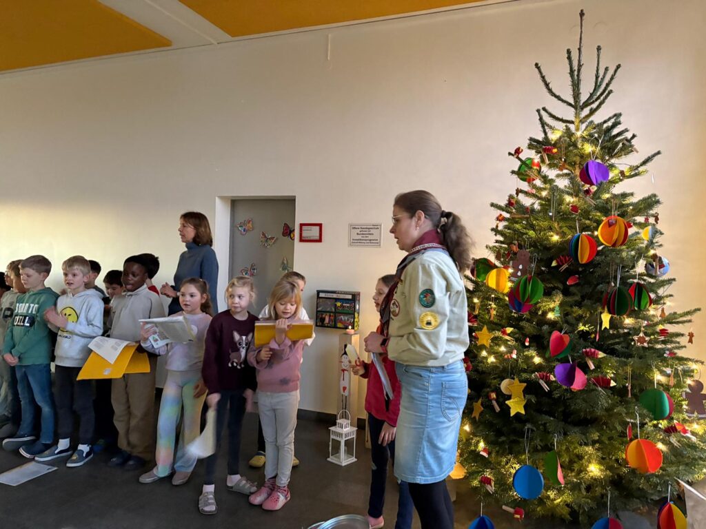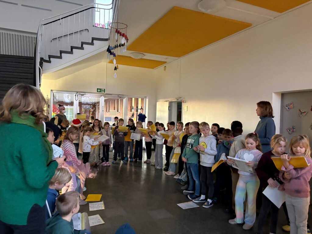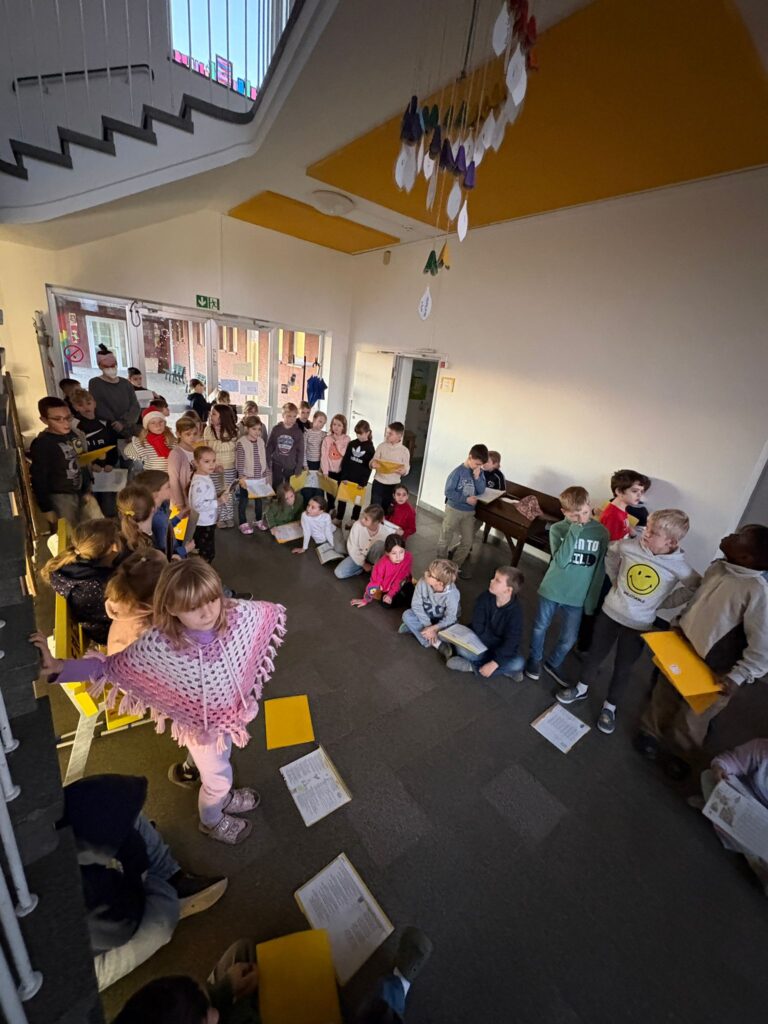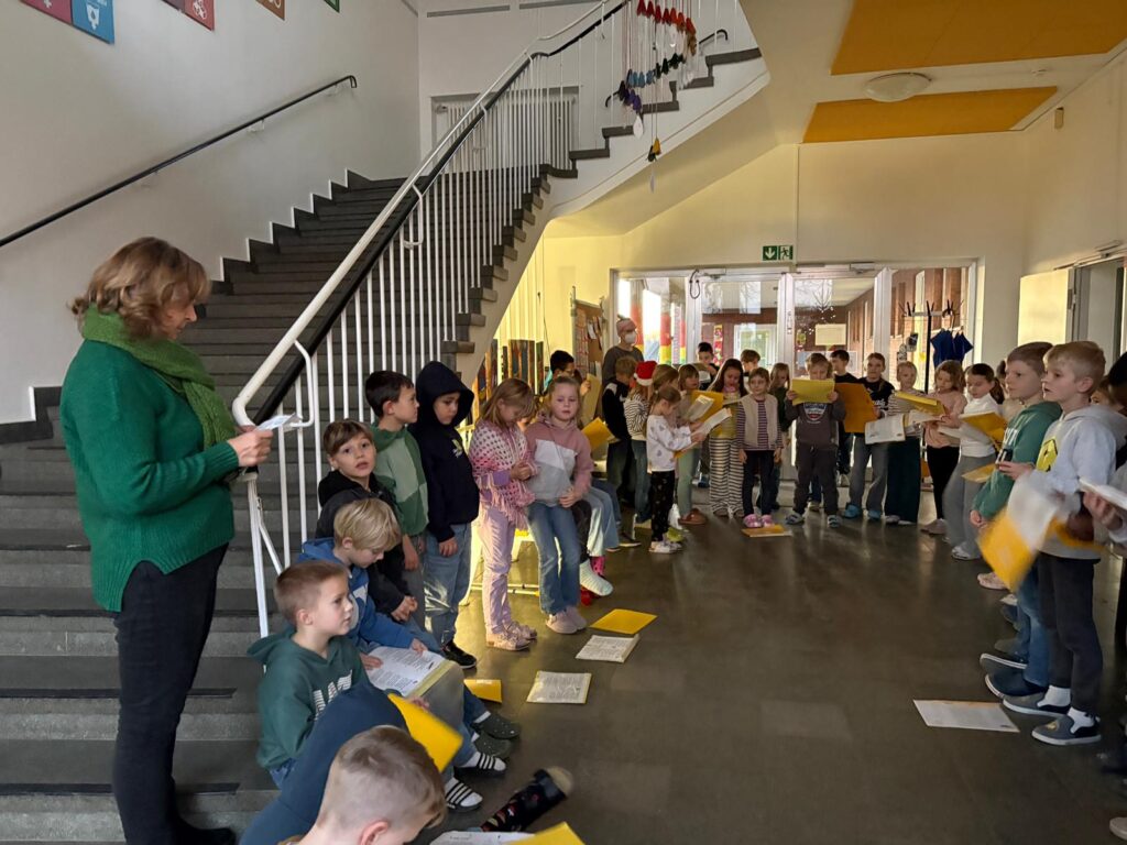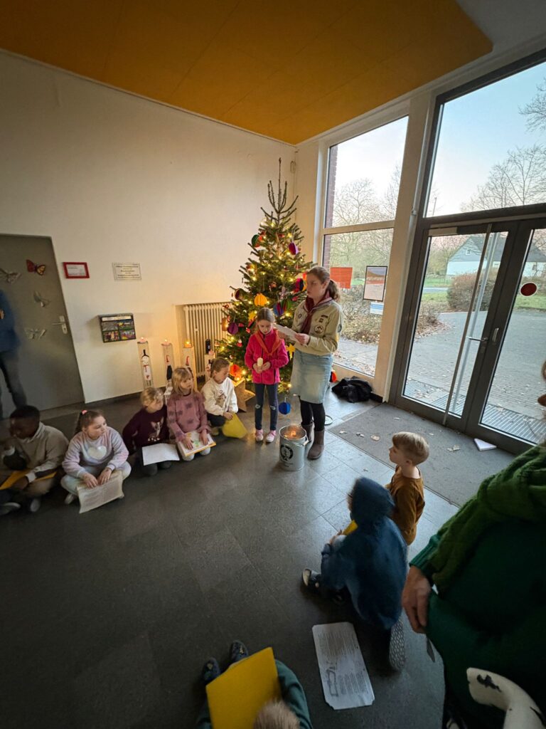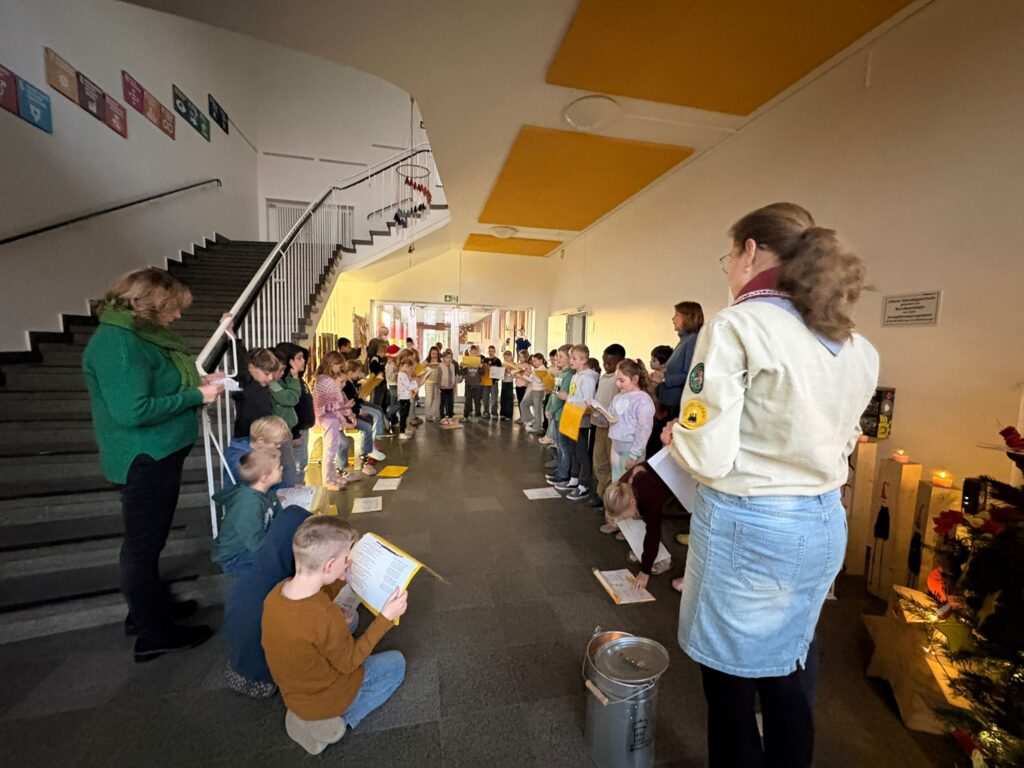 Die Kinder des zweiten Jahrgangs lauschten ganz andächtig und sangen passende Advents- und Weihnachtslieder. Unter anderem erklangen „Tragt in die Welt nun ein Licht“ und „Im Advent“. 🎄 Das gemeinsame Singen schuf eine ruhige, warme und vorweihnachtliche Atmosphäre.