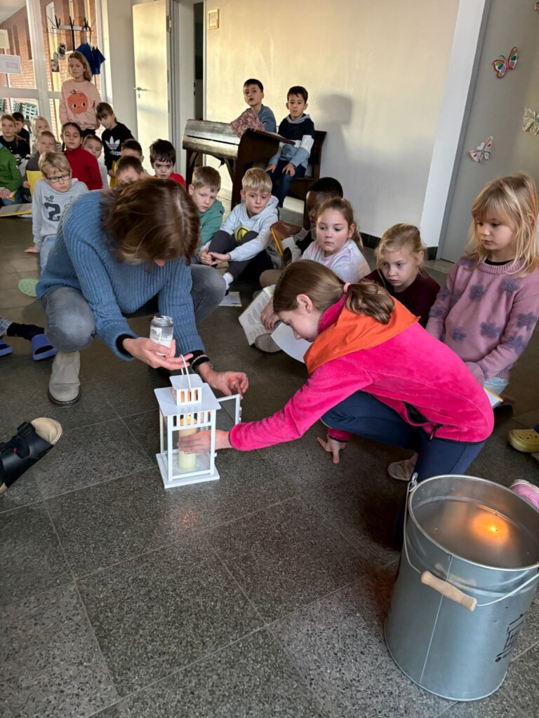 Frau Lemke erzählte den Kindern die Geschichte des Friedenslichtes. Ein Kind aus Österreich reiste mit seinen Eltern nach Bethlehem, um dort das Licht zu entzünden und weiterzugeben. Diese Reise erfordert Mut, gerade in einer Zeit, in der die Situation in Israel von großen Herausforderungen und Unsicherheit geprägt ist. Das Friedenslicht steht in diesem Jahr besonders für Mut, Hoffnung und den Wunsch nach Frieden. 🤍