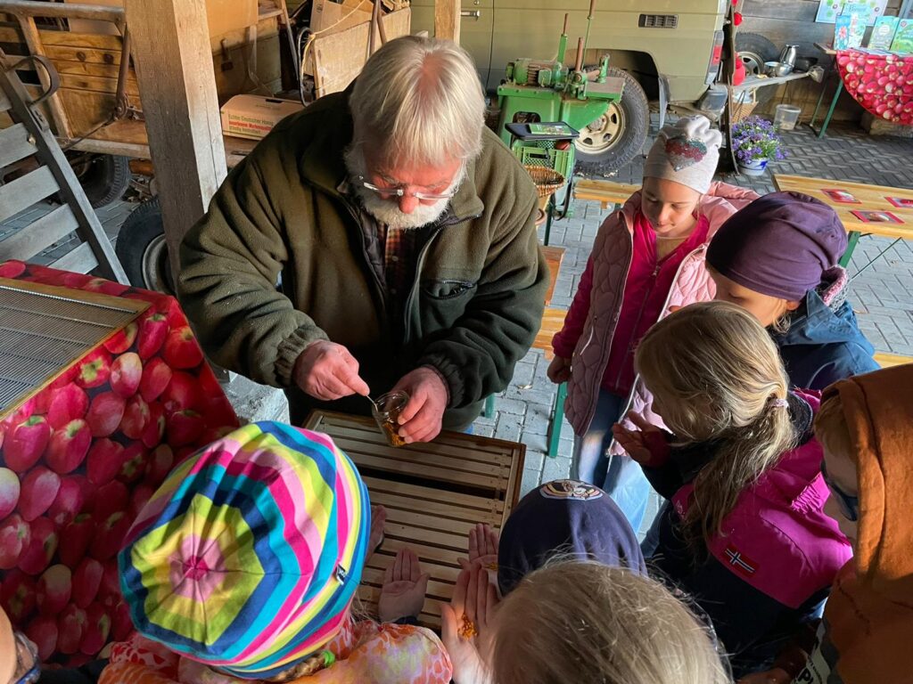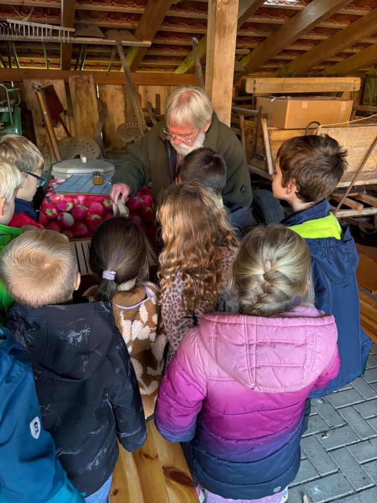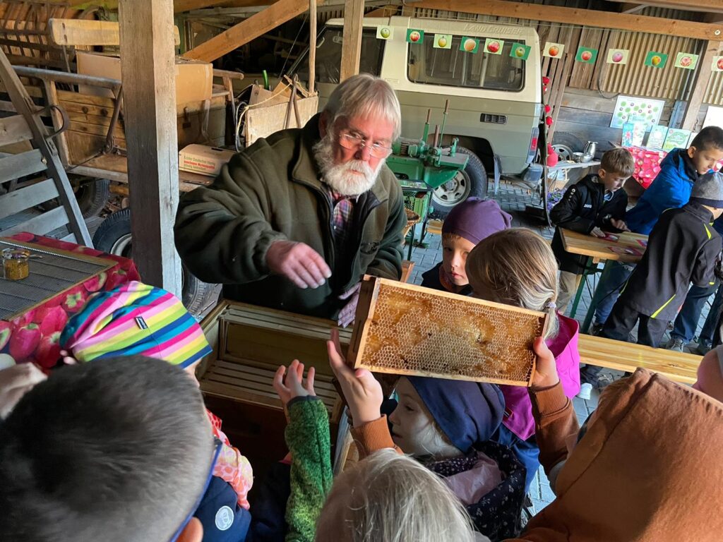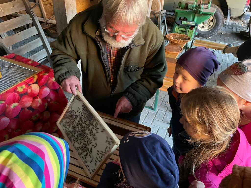 Ein weiteres Highlight war der Besuch eines Imkers. Er erklärte anschaulich, wie Bienen arbeiten, warum sie für die Bestäubung so wichtig sind und wie dadurch im Herbst die Apfelbäume ihre vielen leckeren Früchte tragen.