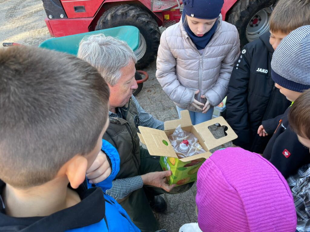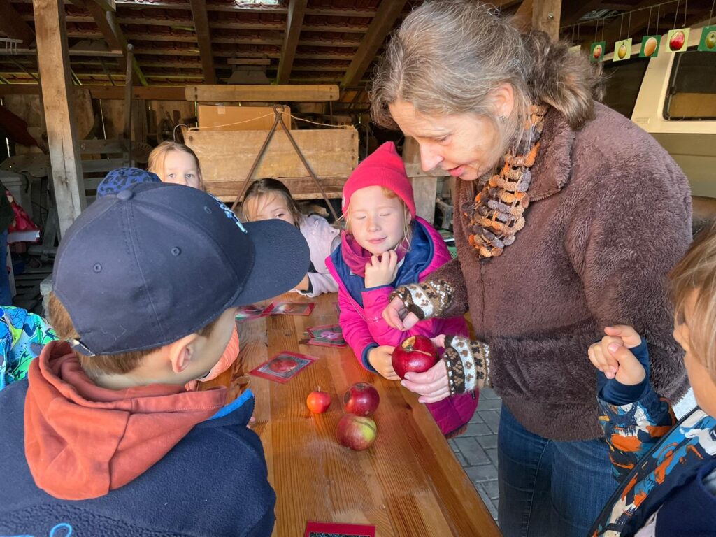 Die Kinder erfuhren zunächst, wie eine Apfelpresse funktioniert und wie aus frischen Äpfeln köstlicher Saft entsteht. Anschließend zeigte Frau Melone verschiedene Apfelsorten, erzählte spannende Geschichten dazu und ließ die Kinder in einer geheimnisvollen Kiste erfühlen, welche Früchte und Gegenstände sich darin befanden.🍏🍎