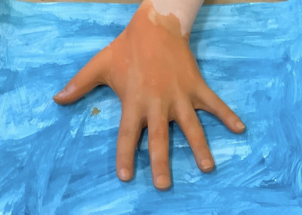 In diesem Abschnitt zeigen wir die Ergebnisse der experimentellen Phase der Delfine. Die Kinder lernten eine neue Technik kennen und setzten sie eigenständig um. Sie arbeiteten mit Acrylfarben, die sie mit Holzspateln auf Pappe auftrugen.